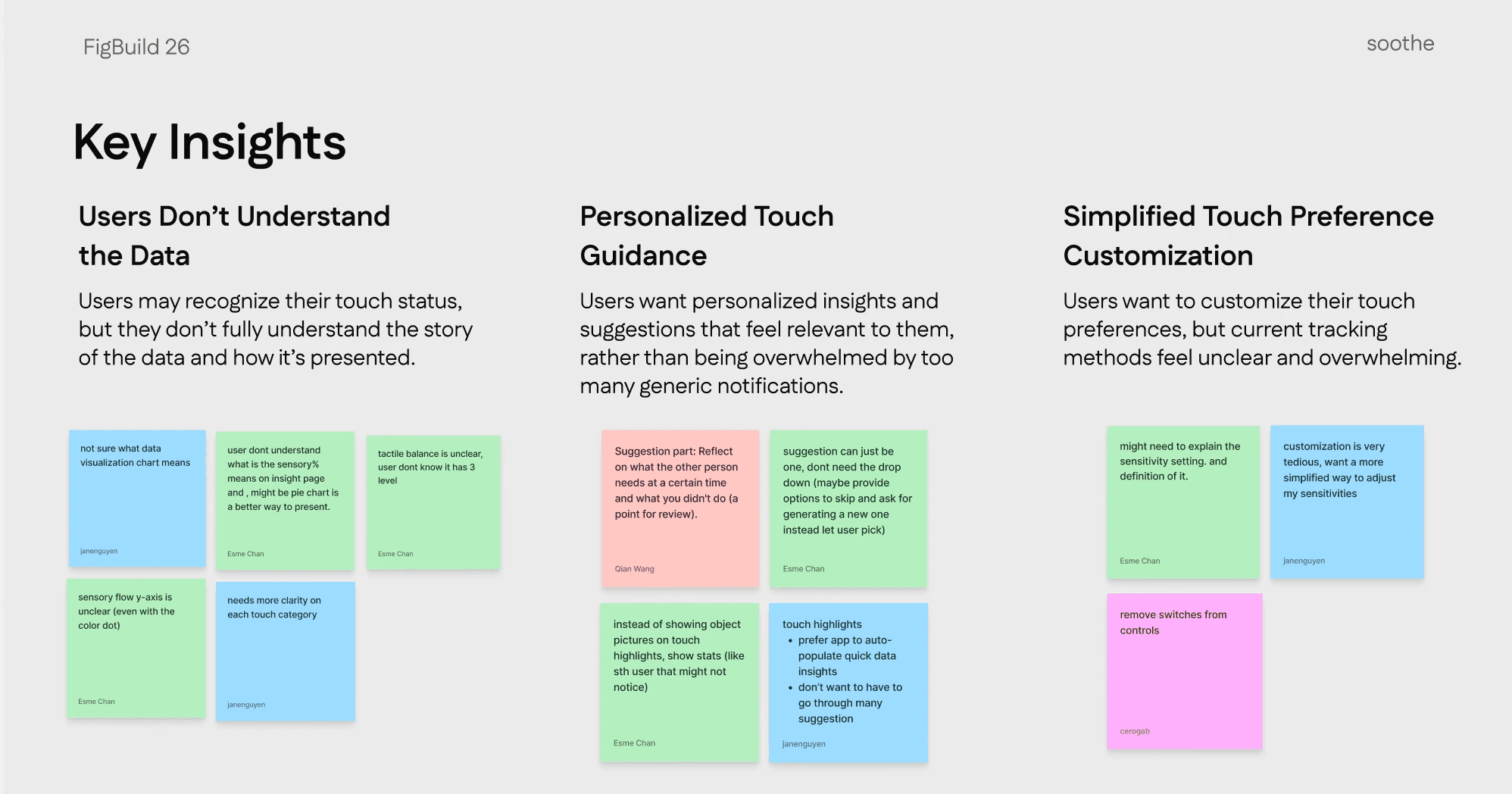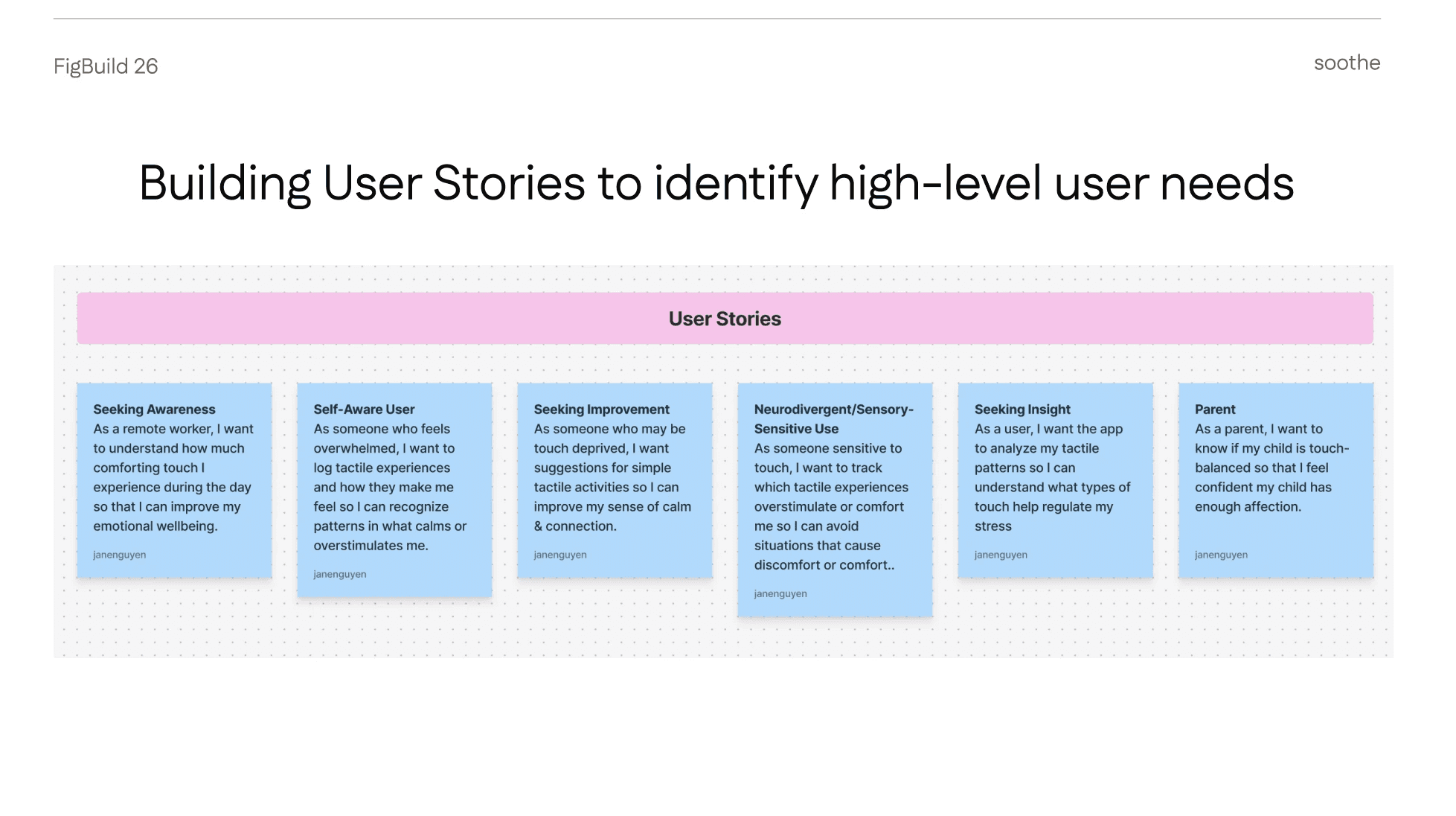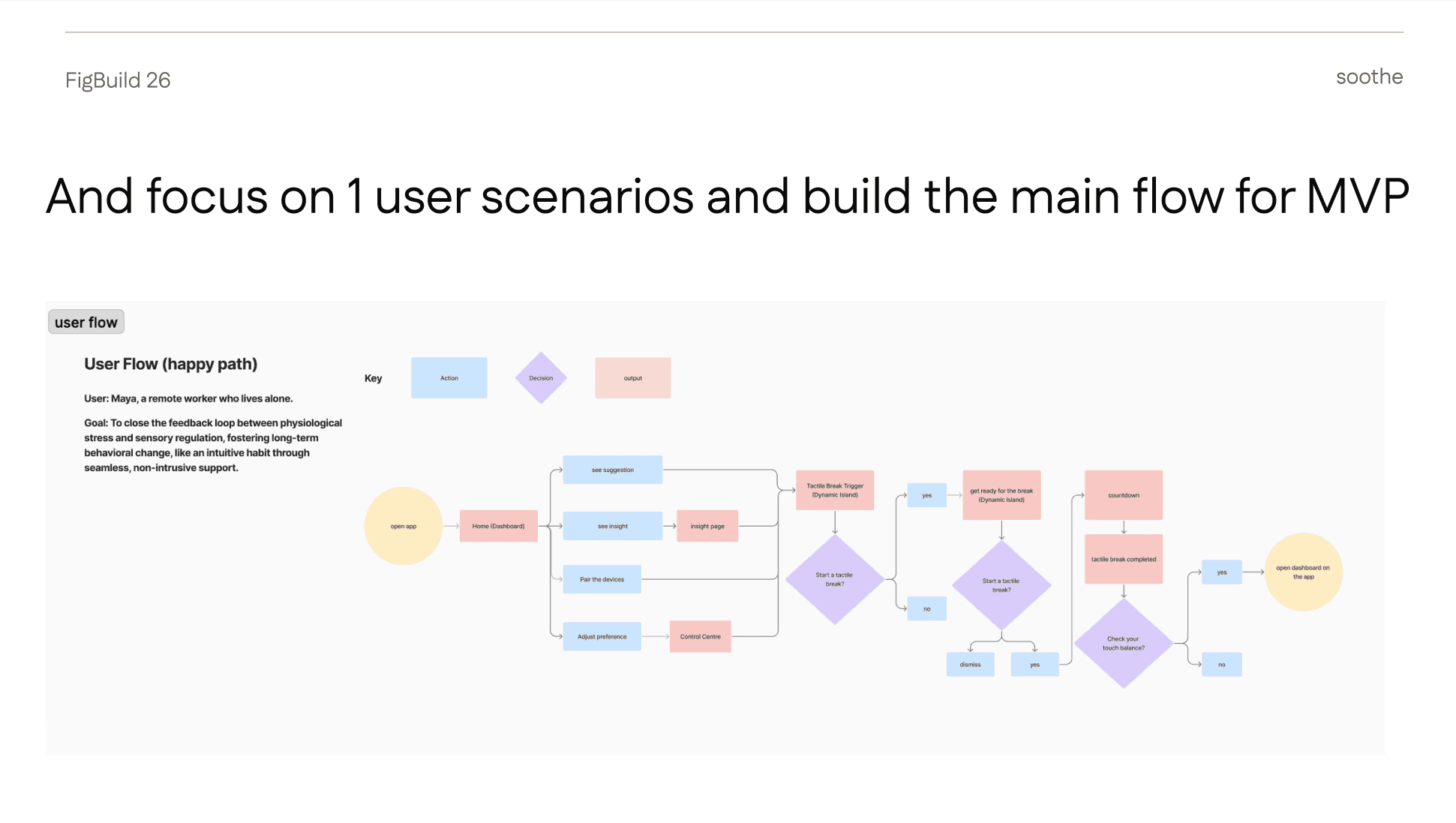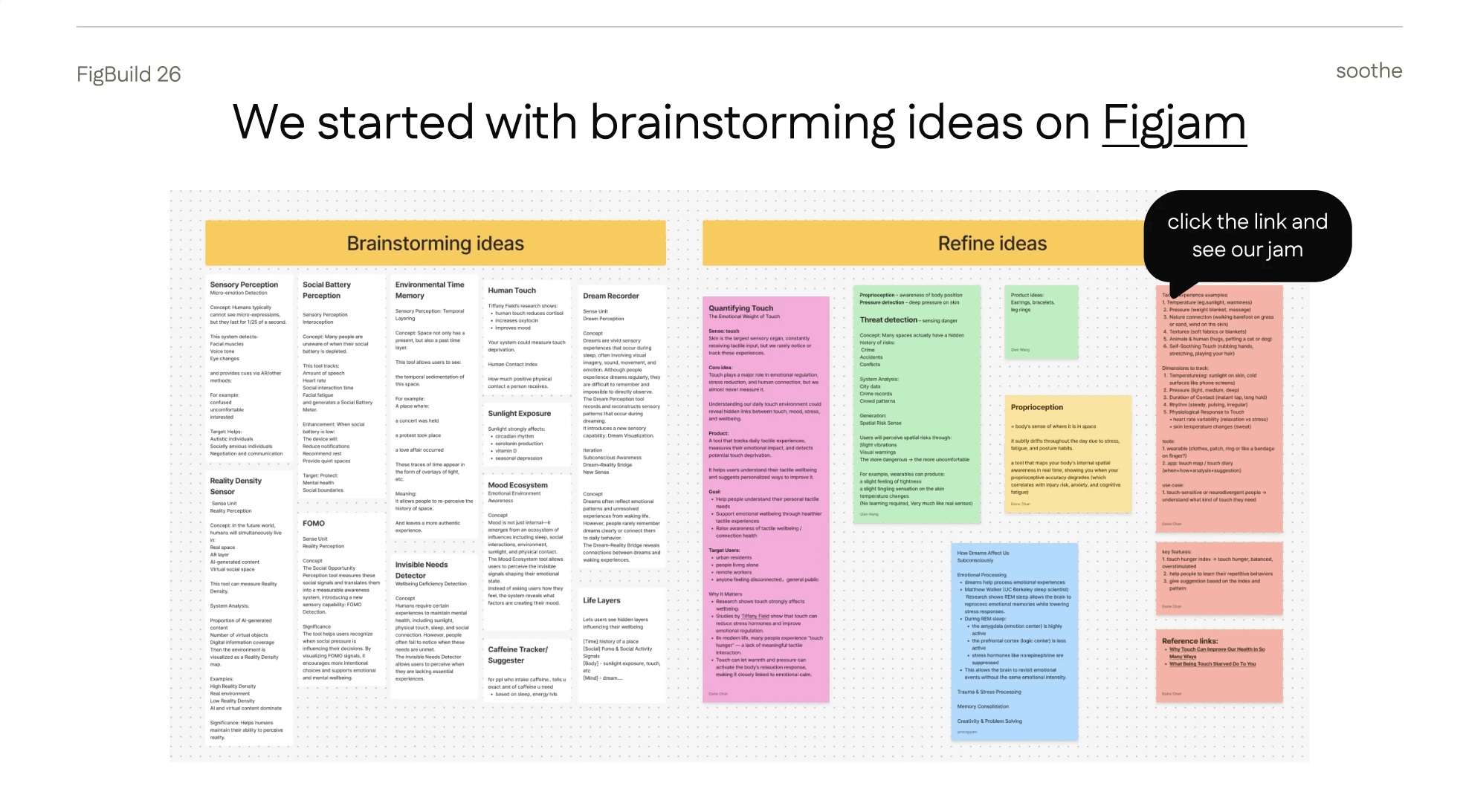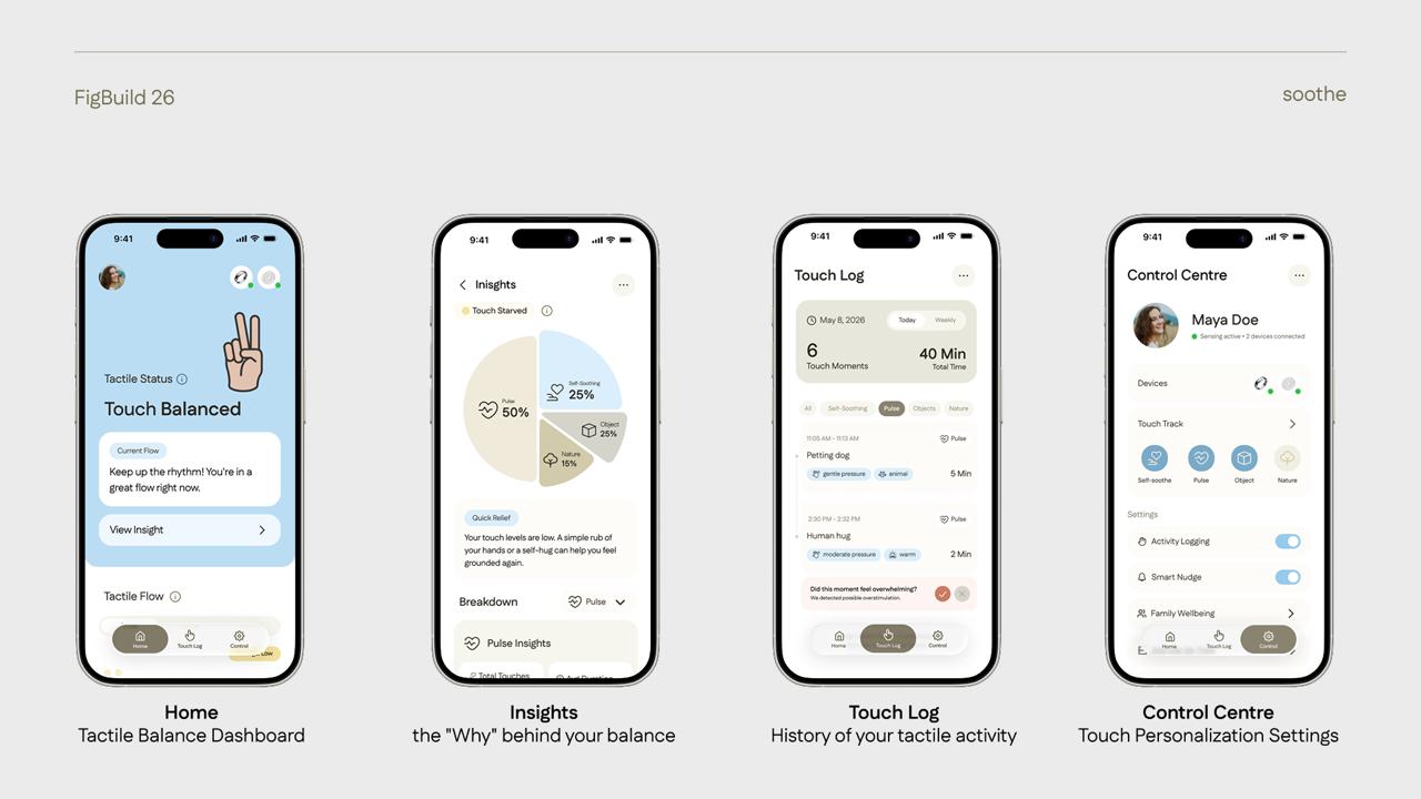 We track our steps, sleep, calories. But what about touch? ✋ At hashtag#FigBuild2026, the brief challenged us to track human sensory experiences beyond the five common senses. As we went down research rabbit holes , one thing stood out: touch is essential for emotional regulation and wellbeing, yet it’s something most wellness tools completely ignore. So in 72 hours, our team designed hashtag#Soothe — a privacy-first tactile wellness platform that helps people understand their sensory needs and stay emotionally grounded.
